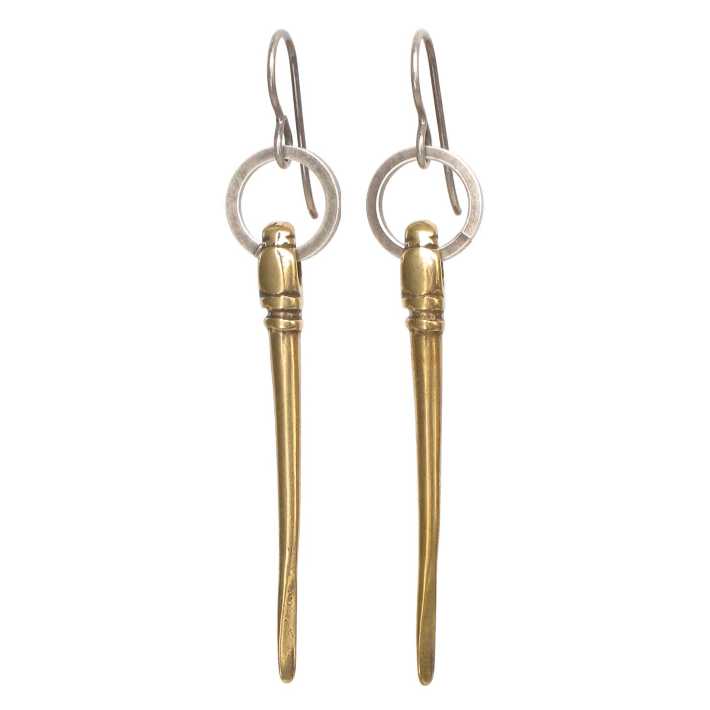 Cast Bronze spike beads hang from oxidized sterling silver earwires and rings.