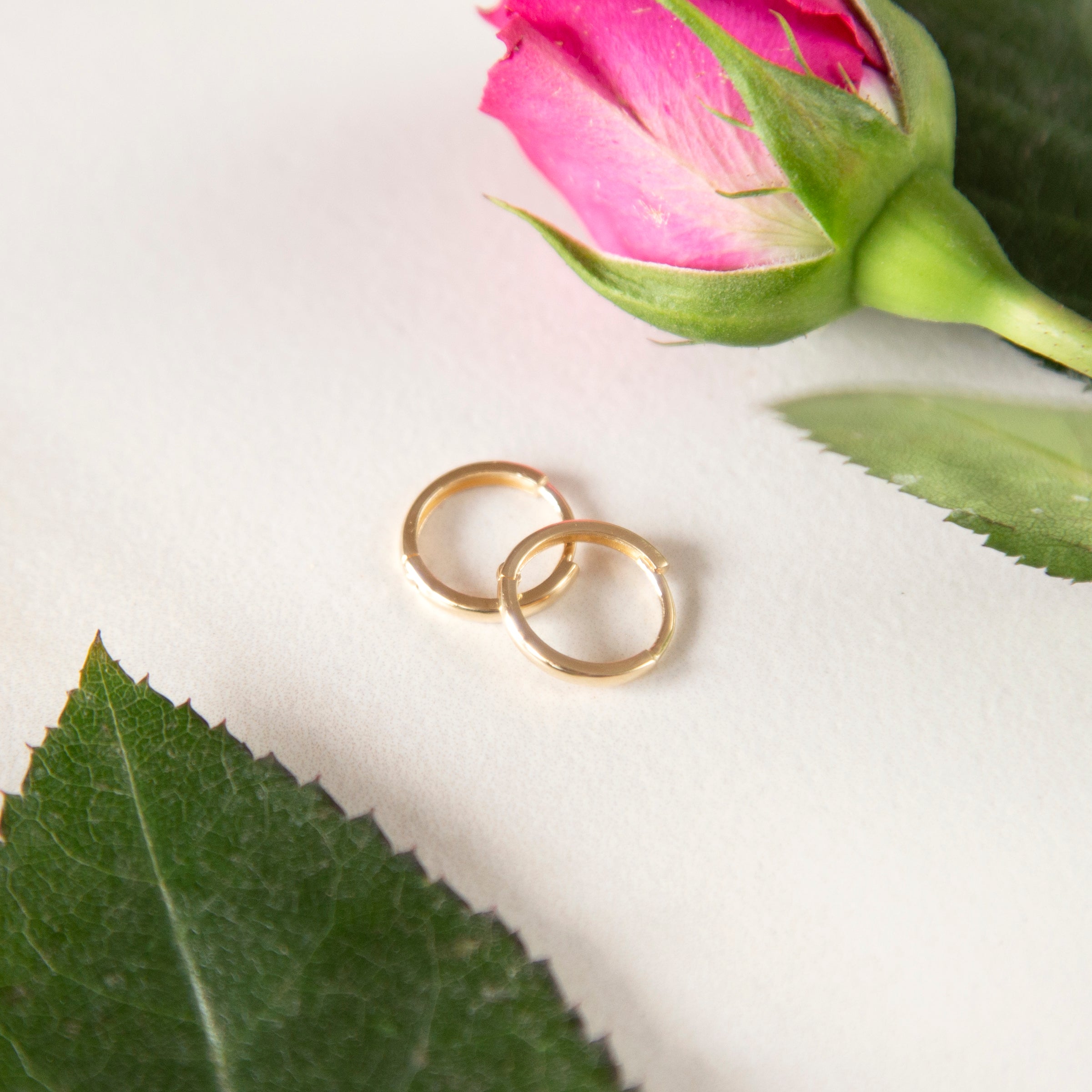 Solid 14k gold huggie-style hoops available in four sizes: 10mm, 12mm, 15mm, 18mm, and 20mm.