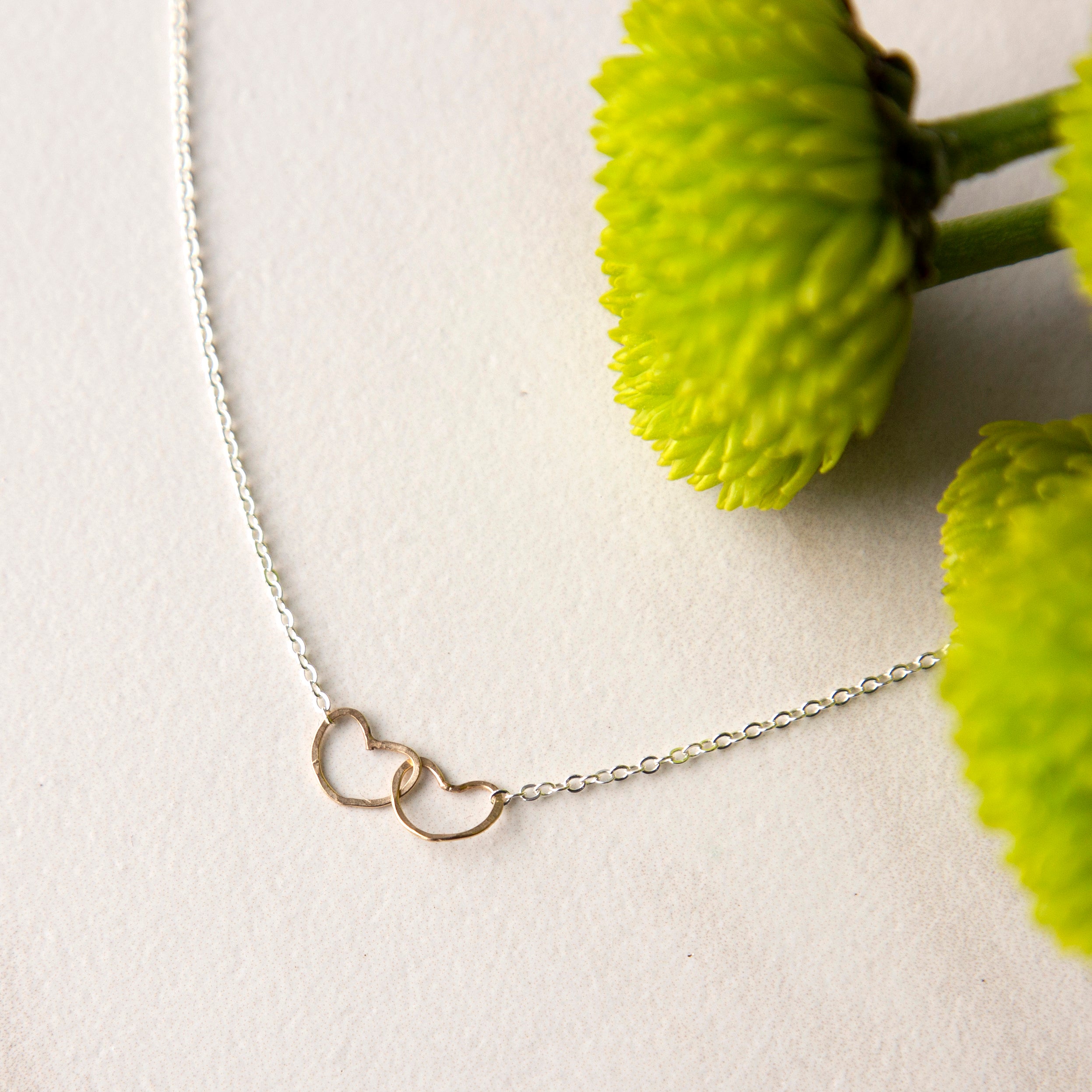 Two handmade solid gold heart shapes on a 16'' sterling silver necklace.